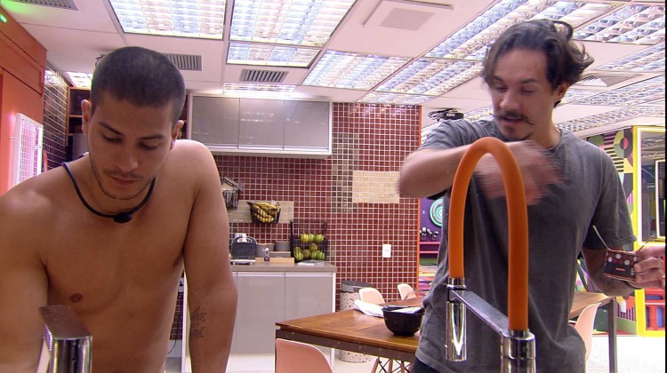 Arthur Aguiar continua lavando a louça na cozinha da Xepa com a ajuda de Eliezer e dispara: "limpei isso aqui outro dia. O pessoal vê que está sujo e ninguém vem lavar. É muito louco isso. Aí o bagulho acumula e aí tem que ficar dez horas esfregando".