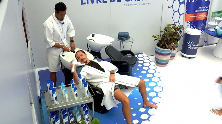 Durante a ação especial da Head & Shoulders, que deu um dia de spa para os brothers, Paulo André lava o cabelo de Eliezer na área externa da casa do BBB 22. O velocista brinca: "Valeu, Head & Shoulders! Que luxo, hein, Eli? Que loucura!".
