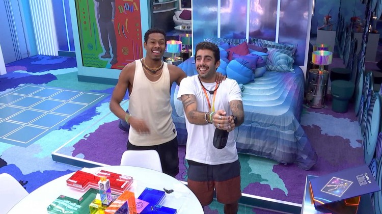 Logo depois, o Líder pega um champanhe e estoura ao lado do atleta. Do lado de fora, os brothers comemoram da sala.