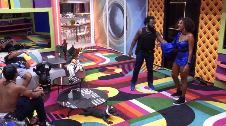 Douglas Silva, Paulo André e Pedro Scooby estão na sala, quando Jessilane chega pronta para a festa desta noite no BBB 22.